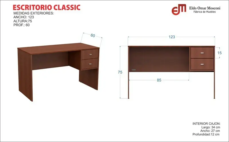 ESCRITORIO CLASSICESPECIFICACIONES:Colores: Venezia- Tabaco- Wengue- BlancoMedidas: 123x75x60 cm.Material: melamina sobre MDP 15 mm. 2 cajones con correderas metálicas, fijos a la derecha.Marca: MosconiPESO SOPORTADO: 50 kg.PESO MÁXIMO POR CAJÓN: 10 kg.PACKAGING: 1 BULTOMedidas: 61x8x125 cm.- Peso: 33 kg.