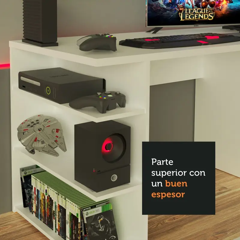 Es perfecto para jugar desde computadora o consola, ya que cuenta con los espacios suficientes y adecuados para que cada uno de sus componentes tenga su espacio propio. La ventilación y los espacios son muy importantes, mantienen siempre los dispositivos a la distancia adecuada para que no se transfiera el calor entre ellos, este escritorio te dará justo eso.