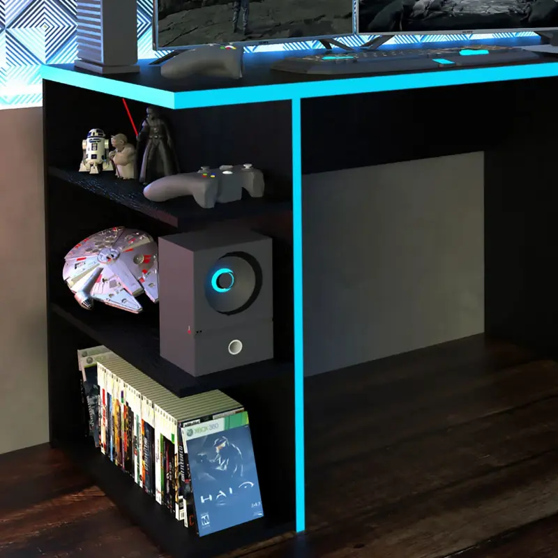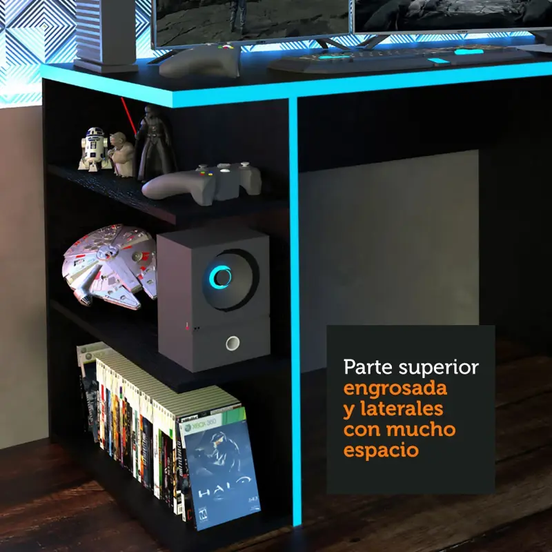 Es perfecto para jugar desde computadora o consola, ya que cuenta con los espacios suficientes y adecuados para que cada uno de sus componentes tenga su espacio propio. La ventilación y los espacios son muy importantes, mantienen siempre los dispositivos a la distancia adecuada para que no se transfiera el calor entre ellos, este escritorio te dará justo eso.