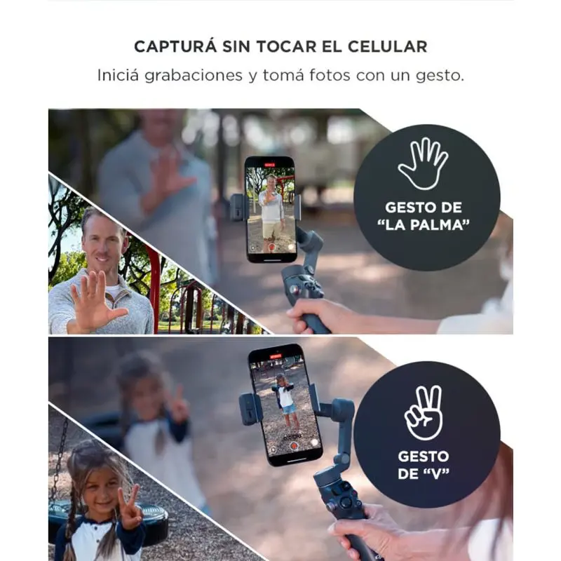 El Osmo Mobile 8 reconoce automáticamente tu rostro y sigue tus movimientos en tiempo real. Con solo mostrar la palma o hacer una “V”, el gimbal inicia o detiene la grabación, cambia el encuadre o toma una foto.