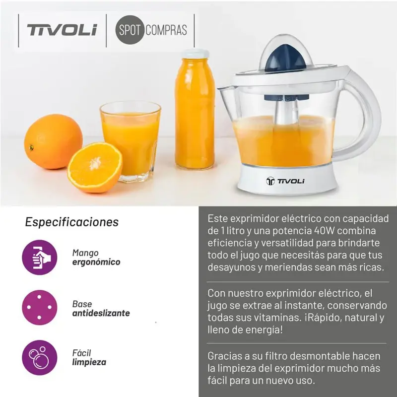 Exprimidor De Jugo Tivoli 1L 40w 2 Conos Antideslizante EET-040B.Este exprimidor eléctrico con capacidad de 1 litro y una potencia 40W combina eficiencia y versatilidad para brindarte todo el jugo que necesitás para que tus desayunos y meriendas sean más ricas.Con nuestro exprimidor eléctrico, el jugo se extrae al instante, conservando todas sus vitaminas. iRápido, natural y lleno de energía!Gracias a su filtro desmontable hacen la limpieza del exprimidor mucho más fácil para un nuevo uso.Especificaciones:* Marca: Tivoli.* Tipo: Exprimidor.* Medidas: 215mm x 220mm x 155mm.* Color: Blanco.* Capacidad: 1L.* Incluye: 1 unidad.