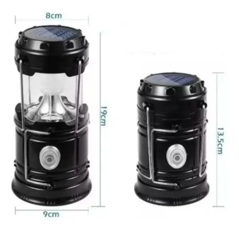 Bateria INCLUIDA!!!Farol- linterna camping 3 WFlujo luminoso: 200 lmAlcance: 200 mProtección: IPX4Material: plástico ABSBatería de litio 18650 ( 1200 mAh )Funciona como cargador de emergenciaPanel solar
