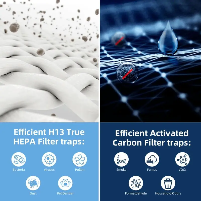 - Filtro HEPA H13: Filtro de carbón activado de alta eficiencia con sistema HEPA verdadero 3 en 1, filtro HEPA verdadero de grado H13. Funciona con el 99.97% de partículas transportadas por el aire tan pequeñas como 0.3 micras de tamaño para adherirse, protegiendo tu hogar del pelo de mascotas, caspa de mascotas y olores.