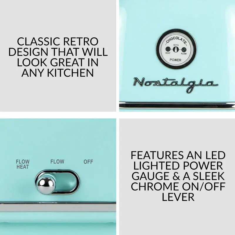 DISEÑO ELEGANTE: esta fuente de chocolate cuenta con una base de acero inoxidable y un diseño escalonado que impresionara a tus invitados y añadira un toque de elegancia y estilo a cualquier evento especial. OPCIONES DE INMERSIoN VERSaTILES: nuestra fuente de fondue es perfecta para mojar varias delicias, como malvaviscos, pretzels, alitas y mas. Incluso puedes usar queso para nachos o salsas para barbacoa para disfrutar de una experiencia unica y deliciosa. Facil de usar y limpiar: vierte la cantidad recomendada de chocolate derretido o cualquier otro solido que se pueda derretir en la base, enciende el motor y observa como ocurre la magia. La fuente se desmonta rapidamente, lo que facilita la limpieza. PERFECTA PARA TODAS LAS OCASIONES: ya sea que organices una boda, una fiesta de cumpleaños o una reunion informal con amigos y familiares, nuestra gran maquina fuente de chocolate sera el alma de la fiesta. NOSTALGIA: desde diseños inspirados en los Estados Unidos de principios del siglo XIX hasta el atractivo atemporal de nuestros electrodomesticos, ofrecemos productos unicos, novedosos y divertidos para la familia. Preservamos el pasado, abrazamos el presente y miramos hacia el futuro.