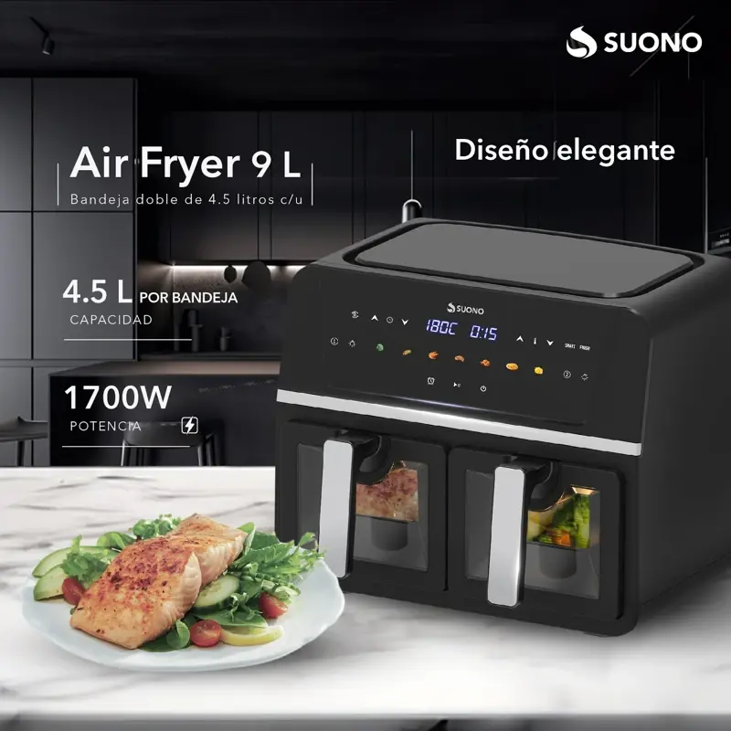 - Capacidad: 9 Litros con ventana y luz interna- Dos bandejas 4,5 + 4,5- Programas de coccion- Panel tactil- Timer : 0-60 minutos- Temperatura adjustable : 80º c - 200ºc- Apagado automatico con alarma de listo - antiadherente antideslizanste -apto lavabajilla- Potencia: 1700W
