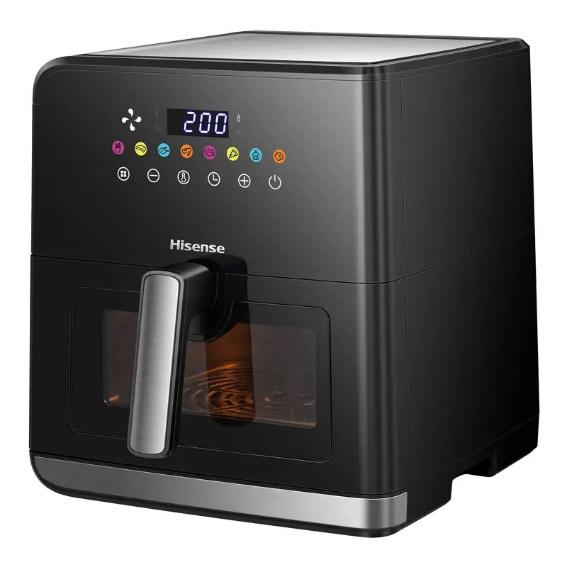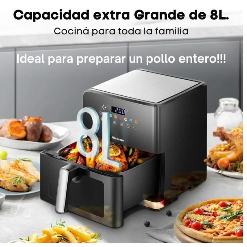 Freidora de Aire Digital Hisense 8L 1700 W H09AFBKS4S Capacidad ideal para grandes familias- 8L La freidora de 8L te facilitara la preparación de las comidas para toda la familia. Con un diseño cuadrado de la cesta permitiendo maximizar el área de cocción y así servir aun mas comida! Freír de manera más saludable con poco aceite La freidora de aire Hisense utiliza aire caliente para cocinar tus alimentos favoritos con hasta un 90% menos de aceite y grasa que la fritura tradicional, pero aún así logra un acabado crujiente dorado perfecto y un interior tierno. Ayudante de cocina versátil 8 programas preestablecidos te ayudarán a obtener la mejor opción de sabor. Los ajustes manuales de tiempo y temperatura permiten que tu creatividad se despliegue libremente en la cocina. Observa tu comida mientras cocina Con una ventana de gran tamaño transparente y una luz interna perfectamente ubicada, no es necesario abrir la cesta; ¡el proceso de cocción es claro con solo un vistazo! Distribución uniforme del calor La freidora de aire utiliza circulación de aire a 360°. El aire caliente circula de arriba abajo y vuelve a subir para crear una distribución de calor perfecta y uniforme. Esto permite obtener una costra crujiente y mantener el interior jugoso. Pantalla táctil fácil de usar La freidora de aire cuenta con un elegante y colorido display de control táctil sensorial. Puedes ajustar fácilmente el tiempo y la temperatura. Las delicias están disponibles con solo tocar un botón. Especificaciones: COLOR: Negra CAPACIDAD NETA (L): 8 VISTA INTERIOR: SI LUZ INTERIOR: SI POTENCIA ( W): 1700 RANGO DE TEMPERATURA: 80- 200 °C CONTROL DE TEMPERATURA: SI PROGRAMAS PRESETEADOS: 8 CANASTA PARA FREIR REMOVIBLE: SI PANEL : LCD CONTROL TOUCH: SI PROTECCIÓN SOBRECALENTAMIENTO: SI FUNCIÓN APAGADO AUTOMÁTICO: SI DIMENSIONES PRODUCTO( ANCHO / PROFUNDIDAD / ALTO ) EN mm: 310 x 379 x 341 PESO NETO (KG): 7.2 Garantía: 12 Meses "La presente publicación está destinada únicamente a consumidores finales. En consecuencia, conforme normas fiscales la factura a emitirse será tipo "B"