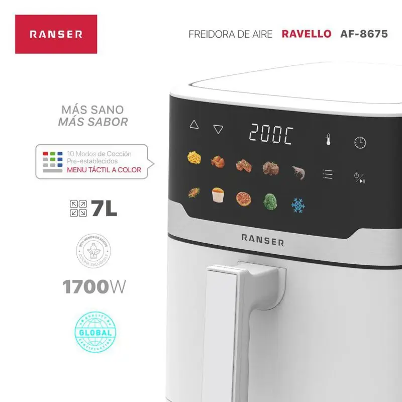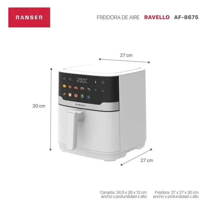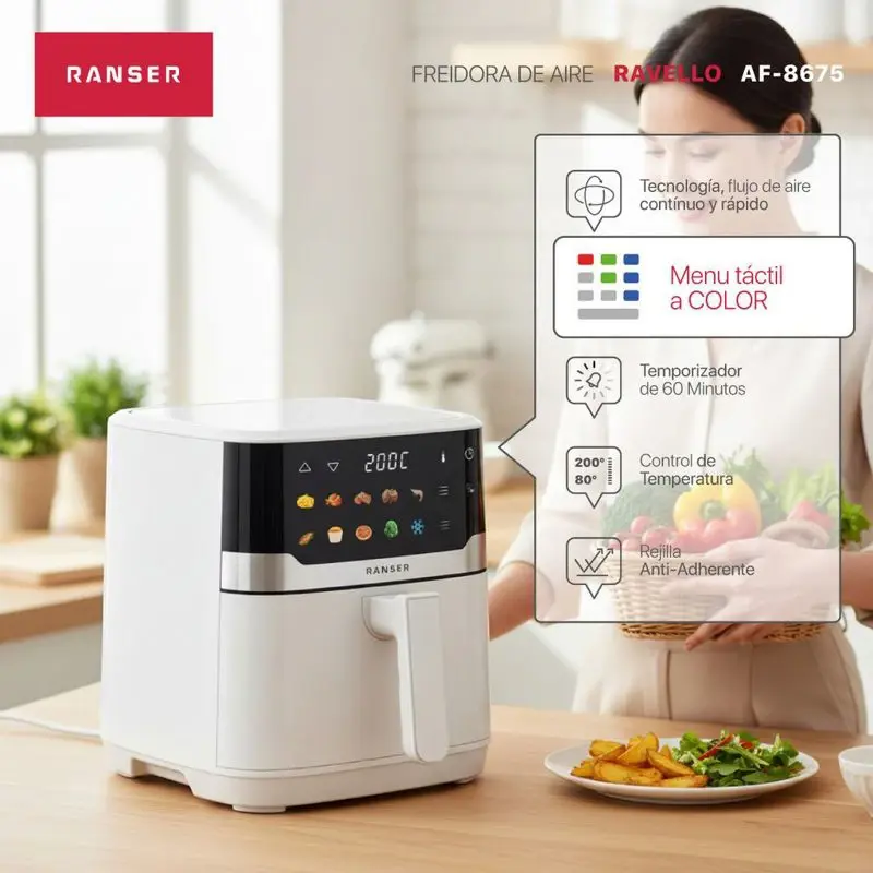 La Ranser Ravello AF-8675 en color blanco es una freidora de aire digital con diseño moderno y elegante, pensada para quienes buscan practicidad y versatilidad en la cocina. Con 7 litros de capacidad, resulta perfecta para preparar porciones abundantes, ya sea en reuniones o en el día a día de la familia.