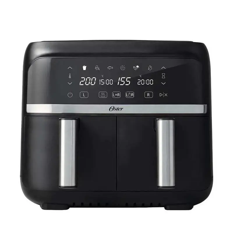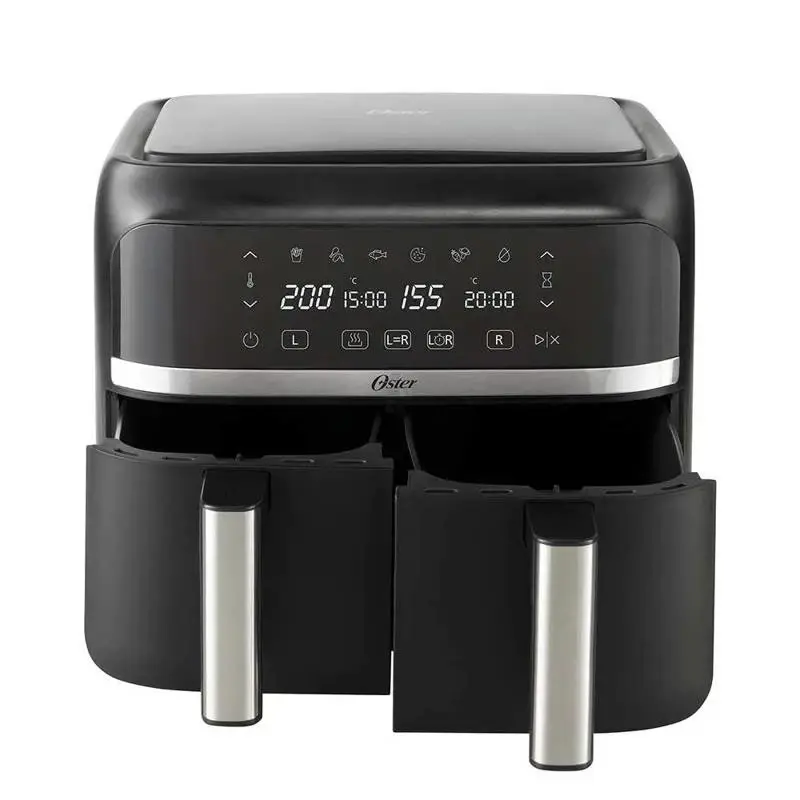 Freidora de aire dual Oster® Con recubrimiento DiamondForce™ La Freidora de aire dual Oster® con recubrimiento DiamondForce es una freidora con dos canastas que te permite cocinar dos platos independientes al mismo tiempo. Tiene una capacidad grande de 7,6L en total, y de 3,8L en cada canasta. 2 canastas, 4 modos de uso Cuenta con 4 modos de uso: canastas independientes, canastas dual, canastas sincronizadas, y precalentar. Con la funcion de canastas independientes, puedes cocinar con dos diferentes funciones independientemente, o si quieres mayor capacidad puedes usar la función canastas dual que te permite usar las dos canastas en la misma función. Con la función canastas sincronizadas, cocina dos platos y la freidora se programará automáticamente para que terminen de cocinarse al mismo tiempo. 6 funciones pre-determinadas Con panel digital y 6 funciones pre-determinadas puedes preparar papas fritas, carnes y aves, pescado, postres, vegetales y deshidratar al toque de un botón. ¿Qué es oster® DiamondForce™? Nuestro recubrimiento antiadherente está reforzado e infundido con partículas de diamante que forman una matriz estructural, creando un recubrimiento más fuerte y proporcionando una fácil liberación de alimentos, y un rendimiento superior a lo largo del tiempo. Garantía de 12 meses