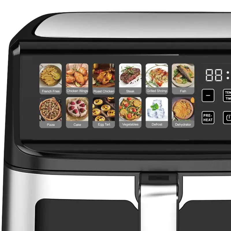 Con una capacidad de 11,9 litros y 2000 watts de potencia, esta freidora es ideal para cocinar porciones familiares o preparar varios platos a la vez. Cuenta con 12 menús de cocción preestablecidos que permiten elegir fácilmente la configuración adecuada para papas fritas, pollo, pizza, vegetales y mucho más. Además, su rango de temperatura va de 80°C a 200°C, adaptándose a todo tipo de recetas.