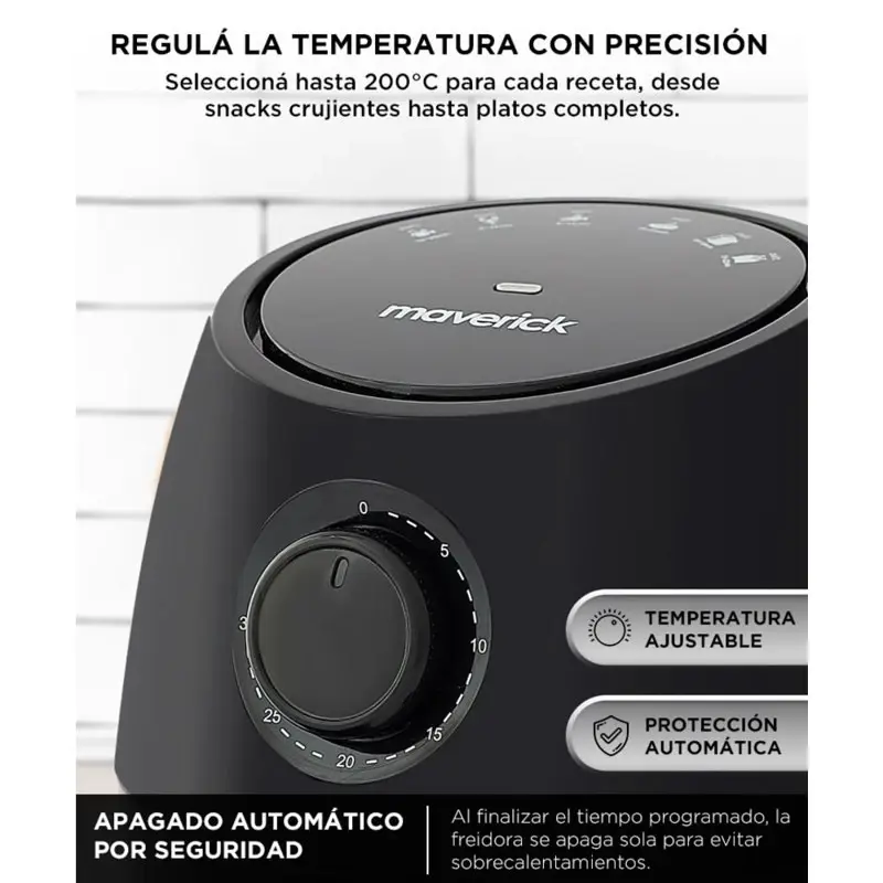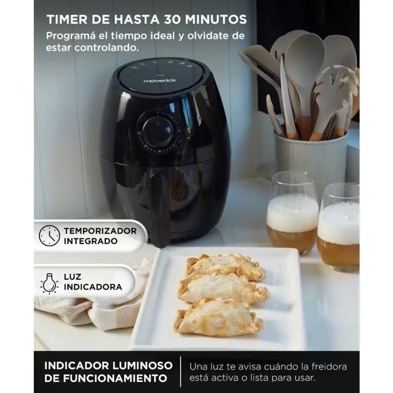 Configurá el tiempo de cocción según el tipo de alimento. La freidora se apaga automáticamente al finalizar.