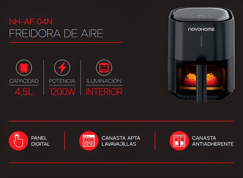 NOVOHOME AIRFRYER 4.5 LTS BLACK CON VENTANA VISOR SKU: NH-AF 04N PLATOS MÁS SANOS Y SABROSOS: La freidora de aire Novohome te permite disfrutar de platos deliciosos y saludables con poco aceite. Su tecnología Fry Force 360° distribuye el calor de manera uniforme, logrando resultados crujientes por fuera y tiernos por dentro, utilizando un 80% menos de grasa. Compacta y fácil de limpiar, es ideal para preparar hasta 4 porciones sin necesidad de precalentarla. CARACTERISTICAS: