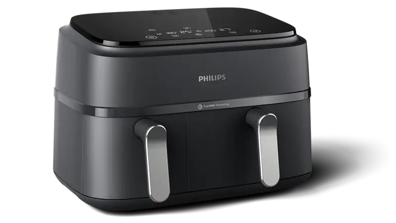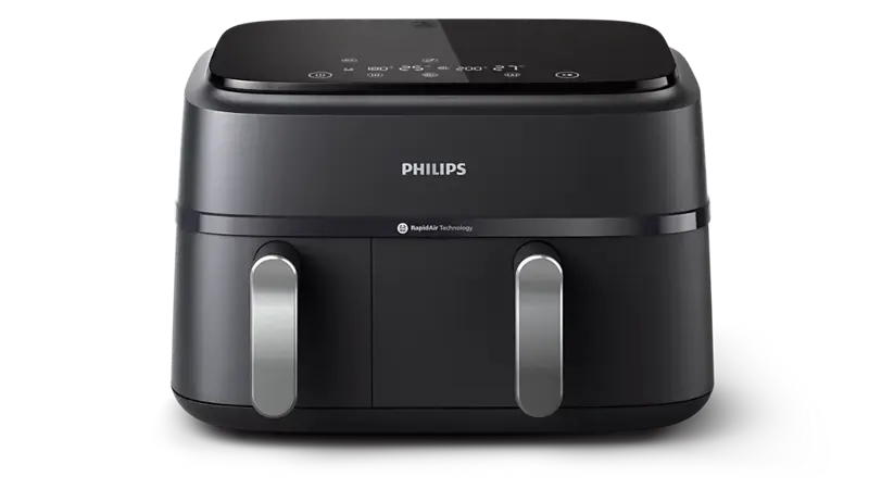 La Airfryer Philips de la Serie 3000 con dos cestas garantiza que dos platos estén listos y calientes al mismo tiempo. Disfrute de una comida sabrosa y saludable con un cajón grande para platos principales destinado a toda la familia, y un cajón más pequeño para guarniciones o comidas individuales.