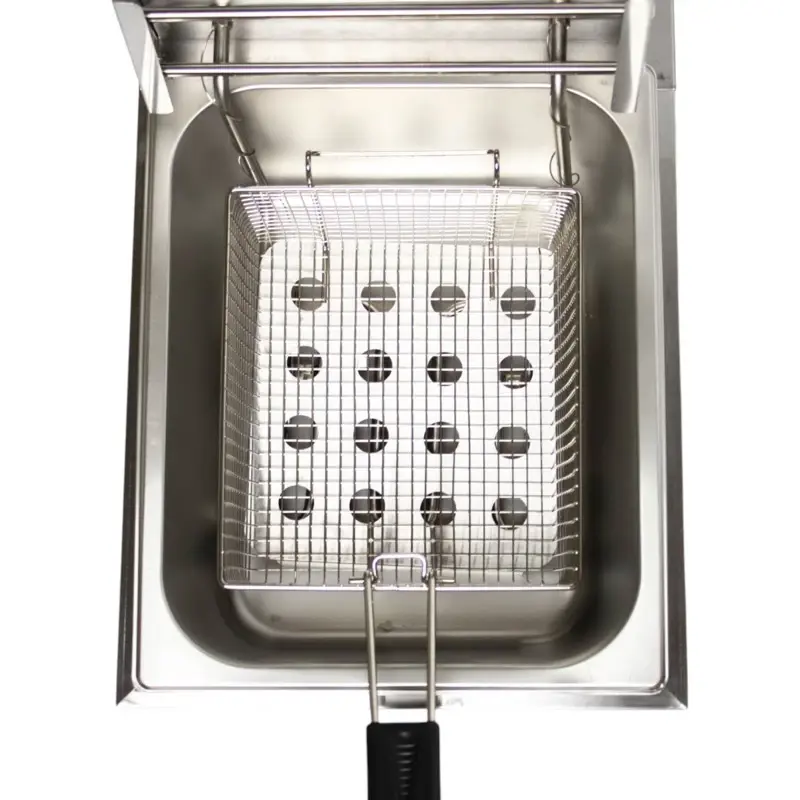 Su cuerpo de acero inoxidable garantiza durabilidad, resistencia a la corrosión y fácil limpieza, mientras que el elemento calefactor sumergido mejora la eficiencia térmica y asegura una fritura uniforme en todo momento. La temperatura ajustable permite seleccionar con precisión el nivel de calor deseado, y las luces indicadoras de encendido y calentamiento facilitan el monitoreo del proceso.