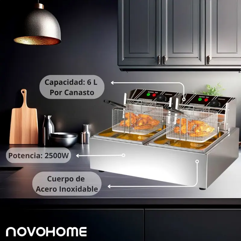 La freidora eléctrica de doble canasto Novohome está diseñada para maximizar la productividad en cocinas profesionales y exigentes. Con una capacidad de 6 litros por canasto y potencia independiente de 2500 watts por compartimiento, permite freír simultáneamente diferentes tipos de alimentos, optimizando tiempos y manteniendo los sabores por separado.