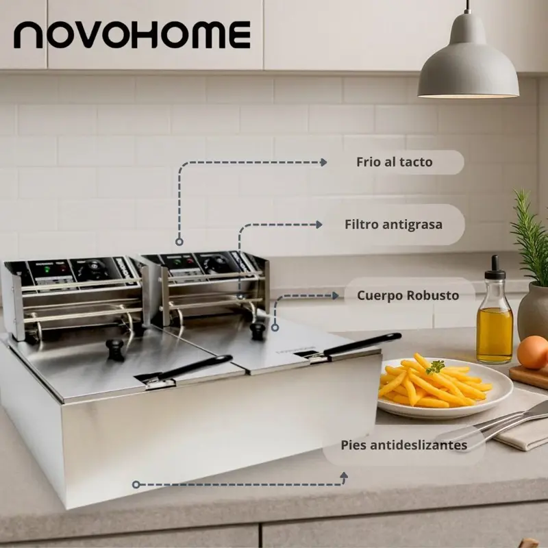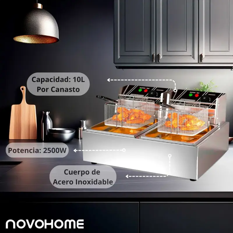 La freidora eléctrica de doble canasto Novohome está diseñada para maximizar la productividad en cocinas profesionales y exigentes. Con una capacidad de 10 litros por canasto y potencia independiente de 2500 watts por compartimiento, permite freír simultáneamente diferentes tipos de alimentos, optimizando tiempos y manteniendo los sabores por separado.