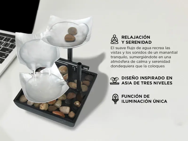 No solo añadirá un toque zen y decorativo a cualquier habitación, sino que también te llevará a un viaje de relajación y serenidad. Nuestra Fuente Decorativa es mucho más que un simple adorno. Con su diseño inspirado en Asia de tres niveles y una función de iluminación única, esta fuente se convierte en una verdadera obra de arte. El suave flujo de agua recrea las vistas y los sonidos de un manantial tranquilo, sumergiéndote en una atmósfera de calma y serenidad dondequiera que la coloques.