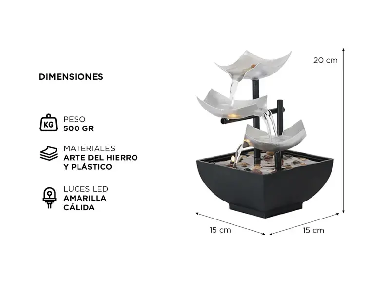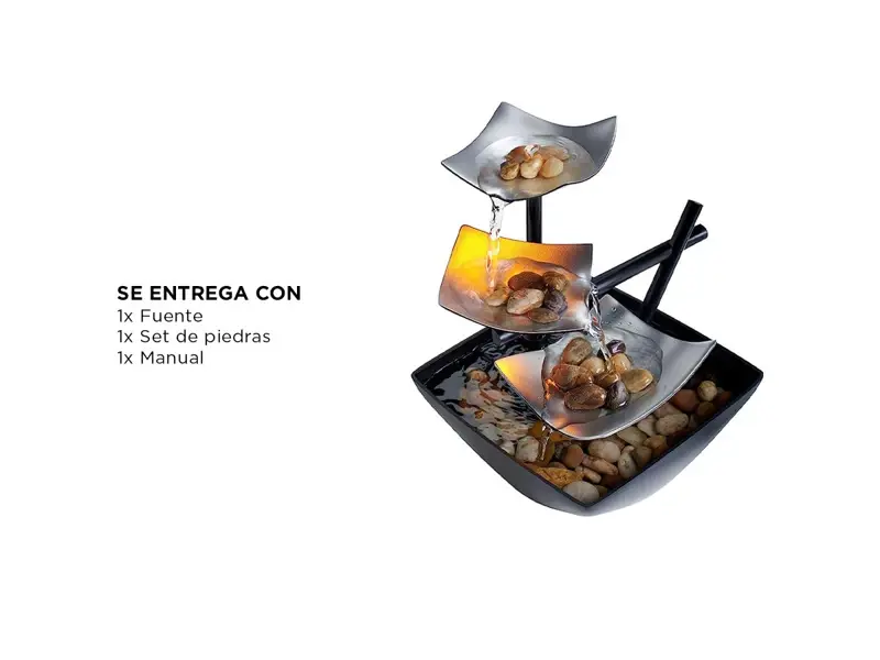 La estética es esencial, y nuestra Fuente Decorativa de Mesa lo entiende perfectamente. Sus tres niveles y el lavabo extra profundo y de estilo abierto te brindan la libertad de personalizarla con rocas naturales de río o cualquier otro elemento que desees. El diseño se integra sin esfuerzo en cualquier entorno, aportando un toque de elegancia con tonos plateados y negros.
