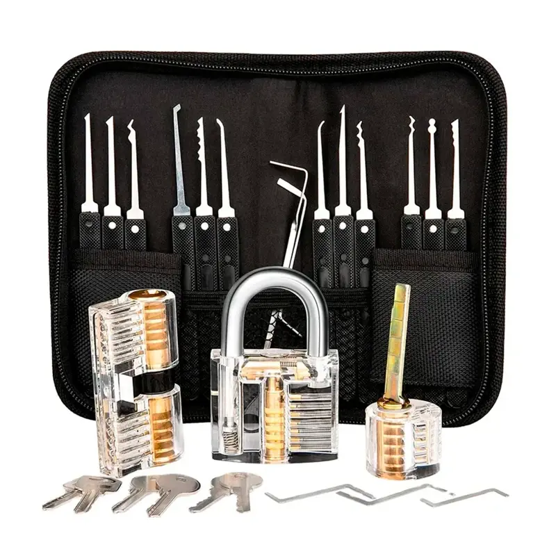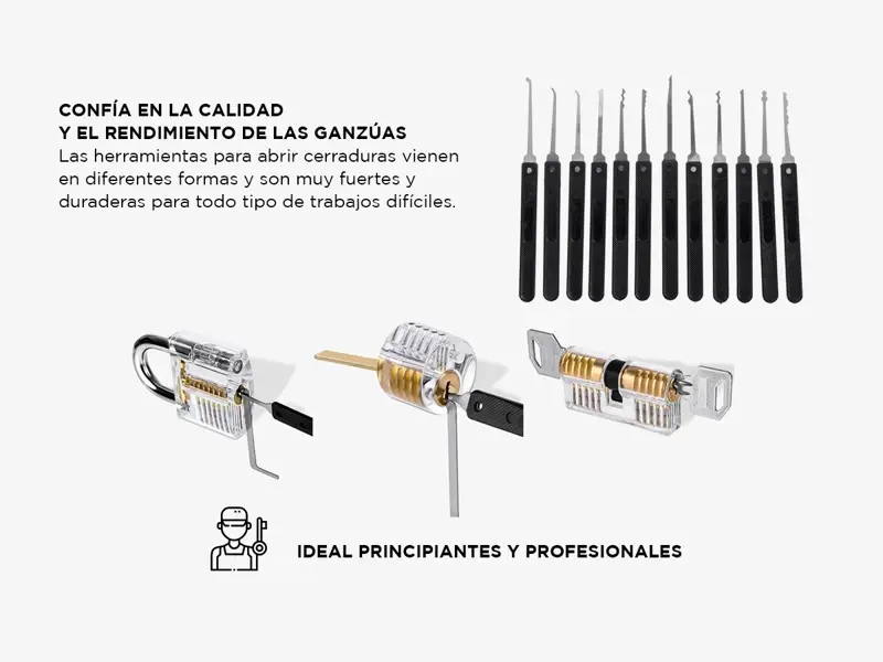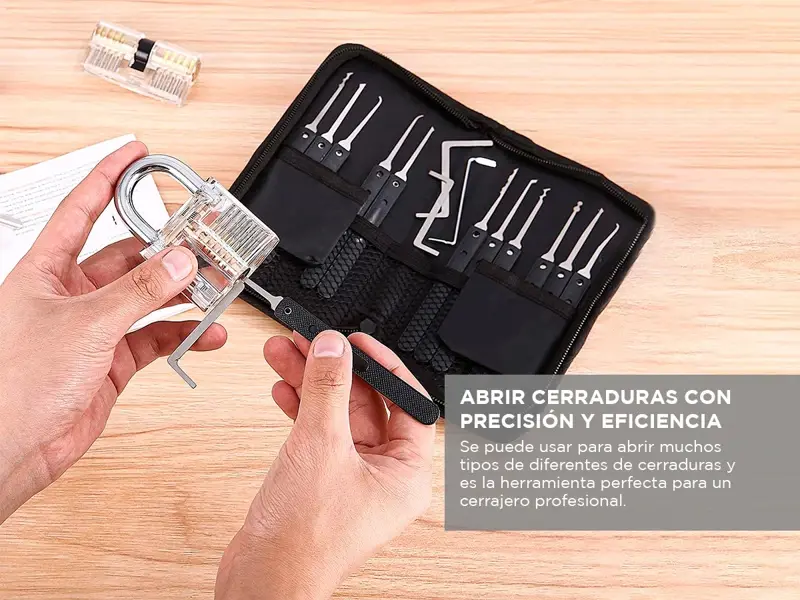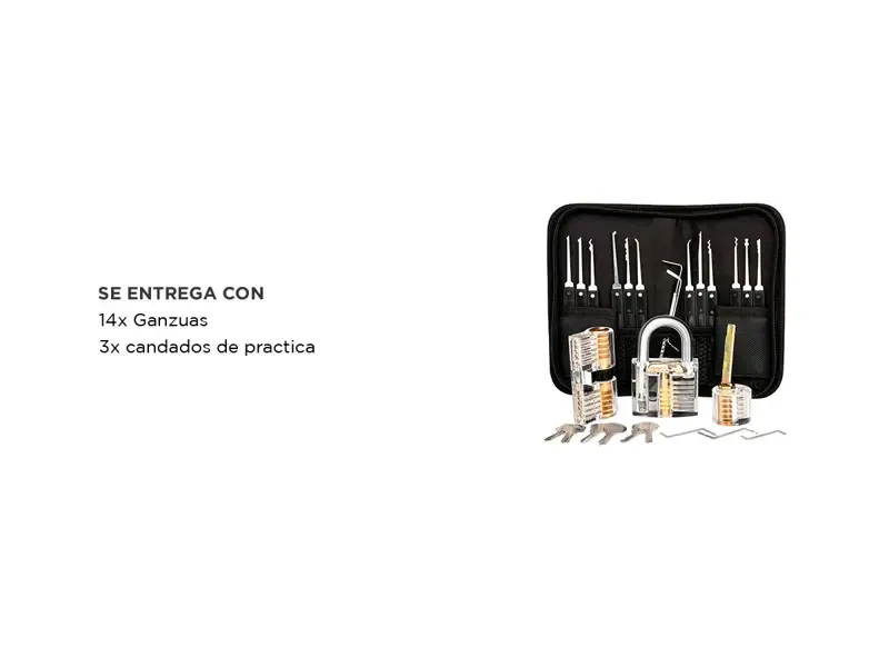 Acerca de Ganzuas profesionales Gadnic 17 piezas Practica Cerrajeros Te presentamos el nuevo set de Ganzuas profesionales! Tu herramienta esencial para abrir cerraduras con precisión y eficiencia! Este completo conjunto de ganzúas ha sido diseñado específicamente para satisfacer las necesidades de los profesionales de la cerrajería, ofreciendo una amplia variedad de herramientas para enfrentar cualquier desafío. Cada ganzúa en este juego ha sido fabricada con materiales de alta calidad y meticulosamente diseñada para proporcionar durabilidad y rendimiento excepcionales. Con una selección de diferentes tipos de ganzúas, podrás abordar una amplia gama de cerraduras, desde cilíndricas y tubulares hasta de paleta y de doble paleta. No importa el tipo de cerradura que encuentres, estarás preparado para superar cualquier obstáculo. El juego de 17 ganzúas profesionales Gadnic también viene en un estuche compacto y resistente que te permite llevarlo contigo a cualquier lugar de trabajo. Ya sea que estés atendiendo una llamada de emergencia o trabajando en un proyecto a largo plazo, tendrás todas las herramientas esenciales al alcance de tu mano. Confía en la calidad y el rendimiento de las ganzúas Gadnic, una marca reconocida en la industria de la cerrajería. Este juego de 17 piezas te proporcionará la confianza y la capacidad para superar cualquier desafío en tu trabajo diario como cerrajero profesional. Especificaciones Material: Acero inoxidable Candado de acrílico transparente Mango: Plastico antideslizante, Cantidad de piezas: 17