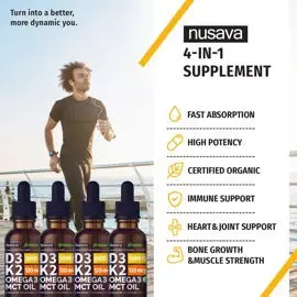 Obtenga su dosis diaria de los multivitaminicos esenciales con el suplemento de vitamina D3, vitamina K2, omega-3 y aceite MCT de Nusava. Creado para ser una vitamina liquida practica y versatil, este suplemento 4 en 1 de maxima concentracion viene en un frasco cuentagotas de 30 ml o 1 onza liquida. Con 30 porciones por botella, tendras 4 meses de potente aporte multivitaminico D. Creado para ser una solucion saludable para su salud, nuestro multivitaminico Nusava tiene como objetivo enriquecer su cuerpo y su mente de todas las formas posibles, eliminando la necesidad de comprar diferentes botellas de suplementos y, en ultima instancia, haciendo que el camino hacia una vida mejor sea mas rapido, fluido y asequible. Dale a tu cuerpo los nutrientes necesarios para mantenerse sano, concentrado y fuerte con Nusava hoy mismo. Ingredientes Vitamina D3 5000 UI, 125 mcg de vitamina K2 (MK4 62,5% y MK7 37,5%), 120 mcg de omega 3 (acido alfa linolenico), 250 mcg de aceite MCT organico (de coco), aceite de semilla de chia organico, aceite de oliva organico Lo que obtienes: 4 frascos cuentagotas de aceite MCT K2 de vitamina D3 K2 de Nusava, vitaminas liquidas, cada botella contiene 1 onza liquida o 30 ml: 1 ml (20 gotas) Porciones por botella: 30