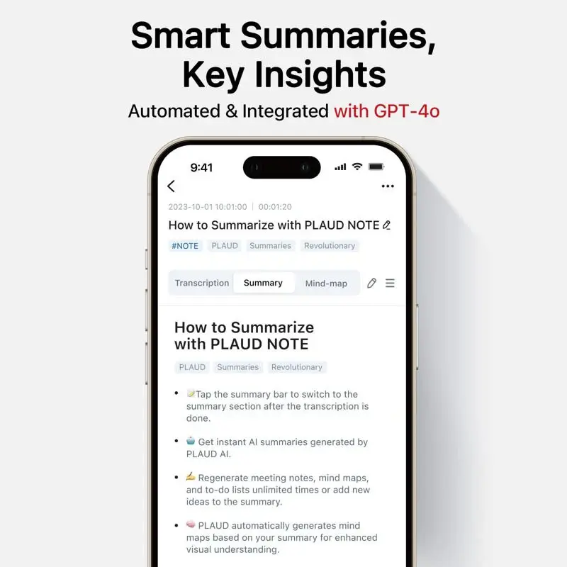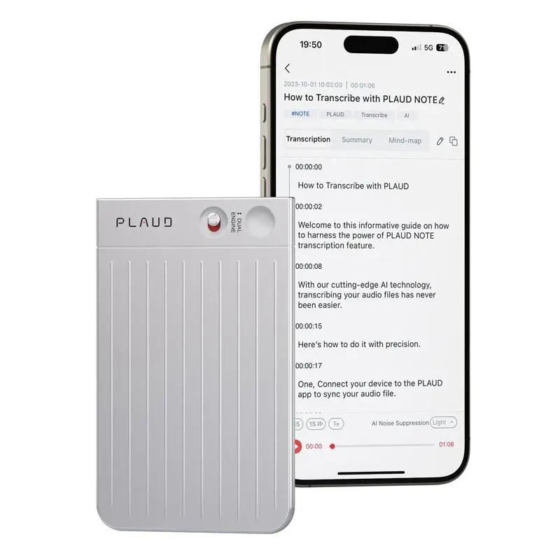 La grabadora de voz PLAUD Note AI subvirtirá las grabadoras de voz que ha utilizado en el pasado. Desarrollado por ChatGPT, PLAUD NOTE combina tecnología de vanguardia con funciones fáciles de usar para impulsar su flujo de trabajo como nunca antes. ¡Da la bienvenida a la eficiencia sin fisuras y despídete de las tareas rutinarias! Transcripción y resumen sin esfuerzo: PLAUD NOTE simplifica las tediosas tareas de transcripción y resumen. Utilizando el modelo Whisper STT de OpenAI, transcribe audio a texto con una precisión excepcional en 57 idiomas. Ya se trate de reuniones, conferencias, entrevistas o notas, PLAUD NOTE te permite convertir voz en texto sin esfuerzo, lo que te permite concentrarte en tus prioridades. Plantillas de resumen inteligentes basadas en inteligencia artificial: con el sistema de resumen basado en inteligencia artificial de PLAUD NOTE, con tecnología GPT4, crear notas de reuniones, resúmenes de conferencias o transcripciones de entrevistas es muy sencillo. Las plantillas personalizables se adaptan a diversas necesidades y ayudan a extraer información clave y elementos de acción de tus grabaciones de manera eficiente. Acceso multiplataforma sin interrupciones: acceda a las grabaciones y transcripciones en cualquier momento y lugar a través de la aplicación móvil y el portal web de PLAUD NOTE. Disfrute de 10 000 minutos de almacenamiento en la nube para organizarlo, reproducirlo y compartirlo fácilmente con sus colegas. Facilite la colaboración en equipo con funciones de transcripción y resumen para compartir y editar cómodamente. Grabación de precisión en modo dual: el motor de grabación dual del PLAUD NOTE garantiza una calidad de audio nítida, capturando con precisión los sonidos ambientales y los sonidos internos del teléfono. Con la grabación con un solo toque y la tecnología de sensor de conducción de vibraciones (VCS), ofrece una claridad y precisión incomparables. Hardware de inteligencia artificial revolucionario: con 30 horas de grabación continua y 64 GB de memoria integrada, el PLAUD NOTE ofrece un amplio almacenamiento y fiabilidad. Su diseño ultradelgado y su tecnología de cancelación de ruido mediante IA lo hacen perfecto para grabar en cualquier lugar, lo que garantiza una calidad de audio impecable. La privacidad es lo primero: PLAUD NOTE prioriza tu privacidad con un cifrado de datos local y estrictos controles de acceso. Su información confidencial permanece segura, y la carga y el procesamiento de datos requieren una autorización explícita por motivos de confidencialidad. TODO LO QUE NECESITAS ESTÁ INCLUIDO: 1 PLAUD NOTE, 1 funda negra, 1 anillo magnético y 1 cable de carga magnético. ADEMÁS: Todos los usuarios disfrutan de 300 minutos gratis al mes para transcribir y resumir con GPT-4o Aumente su productividad y agilice su flujo de trabajo con PLAUD NOTE, el mejor asistente basado en inteligencia artificial para profesionales modernos. plaid note