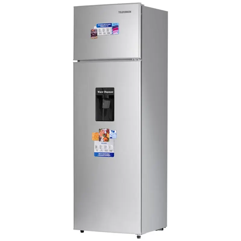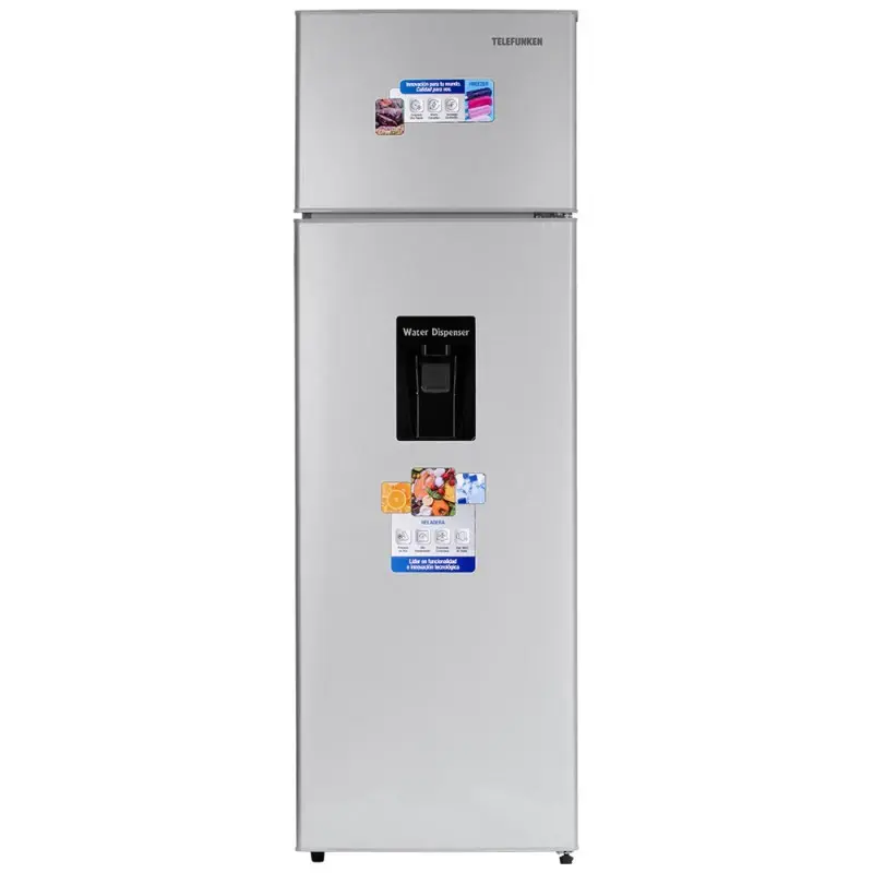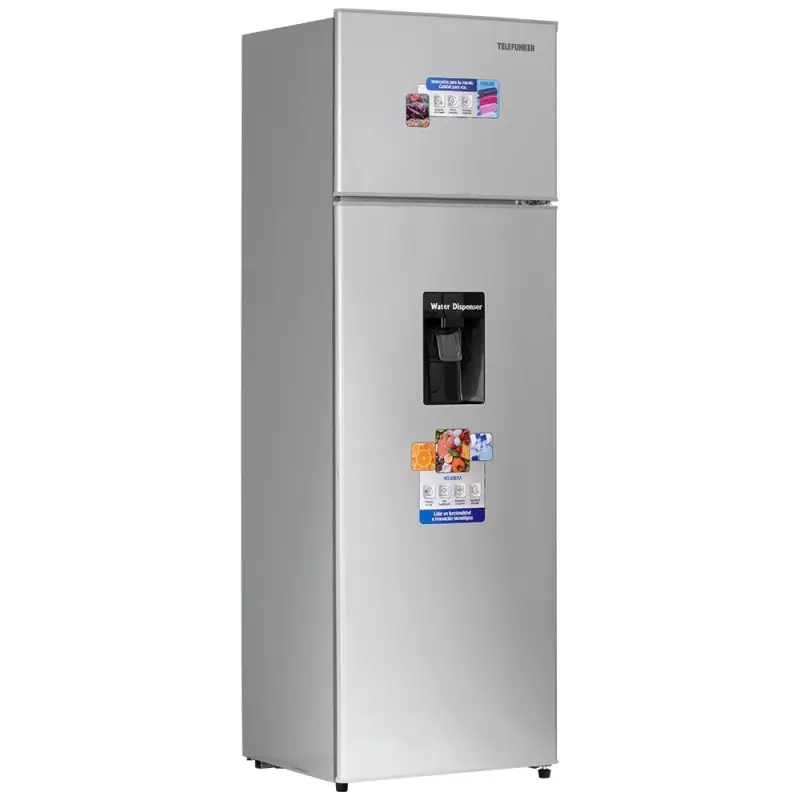 Heladera con freezer 296L PLATA CON DISPENSER TELEFUNKEN- Capacidad bruta: 300 litros- Refrigerante: R600A- Eficiencia A- Descongelado manual- Condensador interno- Luz interior- Estantes de vidrio- Caj¦nn para verduras- Regulador de temperatura- Color PLATA- Tama¦±o: L 575mm ; P 560mm ; A 1740mm- Peso: 40 kg- Modelo TFK-HD300D- Garantia: 12 meses- Origen: China