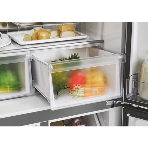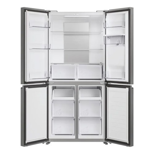 Su interior dispone de estantes de vidrio templado, iluminación LED y dispensador de agua en la puerta, además de amplios cajones para organizar alimentos frescos y congelados. El sistema de puertas múltiples permite abrir únicamente el sector necesario, reduciendo la pérdida de frío. Con eficiencia energética Clase E, es una opción moderna, funcional y elegante para cualquier cocina.