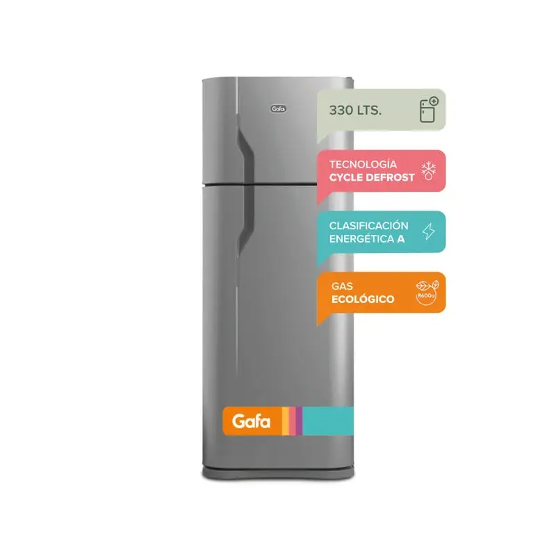 La Heladera con Freezer Gafa HGF368 AFP Plata con 330L de capacidad de almacenamiento, es la solución ideal para preservar alimentos y bebidas de todo tipo, de forma práctica y organizada. Su clasificación de Eficiencia Energética A, hace que la heladera sea más eficiente, con un menor consumo de energía. Además, cuenta con un gas más ecológico, que cuida el medioambiente y no daña la capa de ozono. Su tecnología Cycle Defrost, además de ser más económica, ayuda a preservar la humedad natural de tus alimentos. GRAN CAPACIDAD: Más espacio para almacenar y organizar alimentos, bebidas y todo tipo de envases con mayor facilidad. CLASIFICACIÓN ENERGÉTICA A: Menor consumo eléctrico para un mayor ahorro en tu cocina. GAS ECOLÓGICO: Cuida el medioambiente y la capa de ozono. ESTANTES DE ALTURA REGULABLE: Permiten adaptar el espacio interno de tu heladera. CAJÓN PARA FRUTAS Y VERDURAS: Ideal para mantener tus frutas y verduras frescas por más tiempo, y al alcance de la mano. MANIJA ERGONÓMICA: Con diseño innovador que facilita la apertura de la heladera. CUBETERAS: Ideal para mantener sus bebidas a la temperatura adecuada. BANDEJA PARA HUEVOS: Dos bandejas con capacidad para 12 huevos. ____________________________ ESPECIFICACIONES » Marca: Gafa » Ancho (cm): 61,4 » Alto (cm): 161,4 » Profundidad (cm): 62,1 » Panel de control: No » Color: Gris Plata » Formato: Freezer Arriba » Inverter: No » Clasificación Energética: A » Control de temperatura: Manual » Dispenser: No » Compartimiento botella: Si » Compartimiento para huevos: Si » Compartimiento frutas/verduras: Si » Cantidad de Estantes: 3 » Material de estantes: Rejilla removibles » Estantes Regulables: Si » Tipo: Cíclicas » N° de Certificado: DCE-F8-063.2 » Certificadora: IRAM » Origen: Argentina » Modelo: HGF368 AFP » N° de Certificado: DCE-F8-063.2 » Certificadora: IRAM » Origen: Argentina » Empresa: ARF