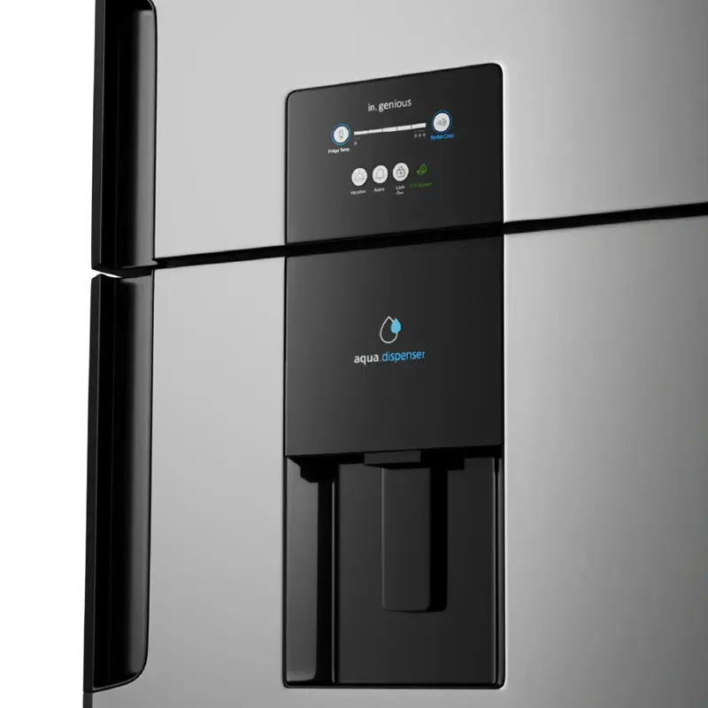 Heladera con freezer no frost. Eficiencia energética A. Color steel. Gas R600a. Deshielo automático. Sistema Total Fresh Flow. Estantes de vidrio templado en refrigerador y freezer regulables en altura. Anaqueles en contrapuerta. Smart factory ice. Dispenser de agua de 2 litros de capacidad. Compartimento Cool Zone para delicados, crisper para frutas y crisper XXL para verduras. Panel digital con función vacaciones, Turbo Cool, bloqueo de panel, control de temperatura y alarma puerta abierta. La función Turbo Cool enfría rápidamente tus bebidas y alimentos. Tecnología Energy Saver Green. Lámina Steel con sistema antihuellas. Luz interior LED.