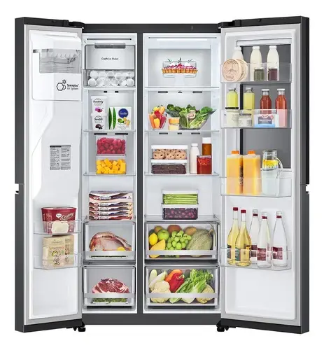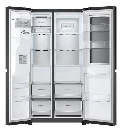 Heladera LG tipo Side by Side InstaView solo con un TocToc en la puerta puedes mirar el interior sin necesidad de abrirla evitando la perdida de aire frio dentro del refrigerador, mantén tus alimentos y bebidas siempre frescos y con la misma temperatura inclusive desde la puerta con la tecnología DoorCooling, disfruta de la exclusividad y la versatilidad de Craft Ice en cada bebida y prolongando el sabor de la misma con el hielo esférico de difusión lenta, protege a todos los que amas con la tecnologia UVNano reduce automáticamente el *99,99% de las bacterias de la boquilla de agua con luz UV, Monitorea o ajusta la temperatura de tu nevera desde un dispositivo móvil solo debes de descargar la App ThinQ.