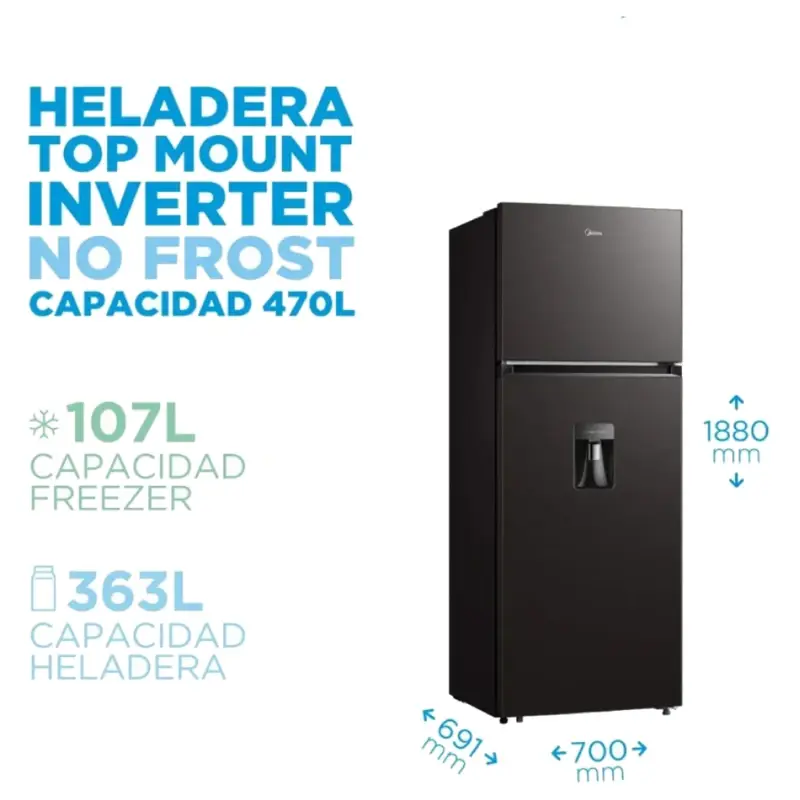 Descubrí la Heladera Midea No Frost Inverter 470L Negra, eficiente y elegante. Con tecnología inverter y eficiencia A++, ¡mantén tus alimentos frescos siempre!