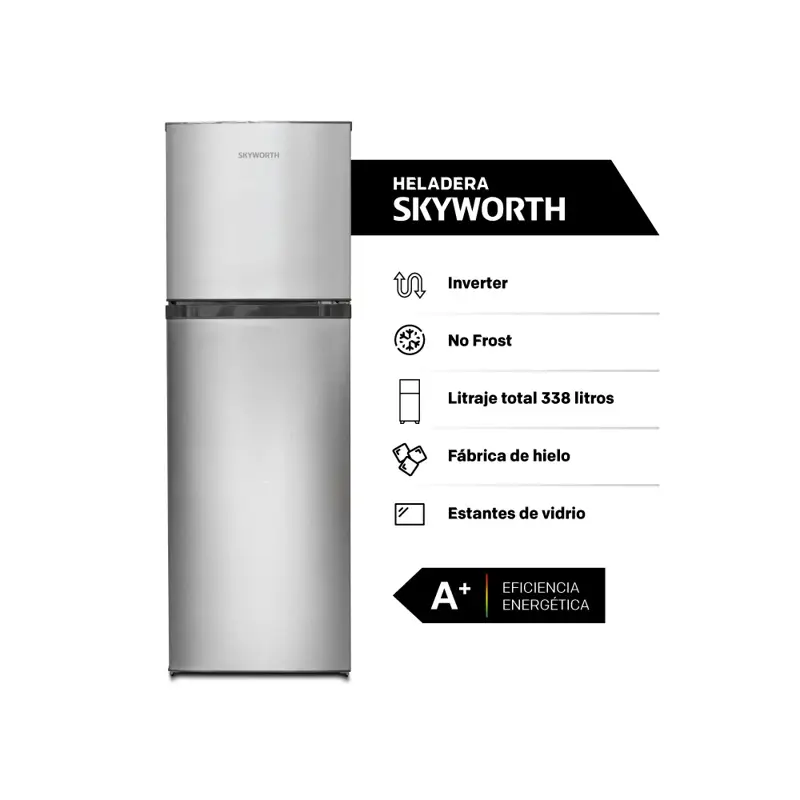 Formato freezer arriba. Heladera con motor inverter y tecnología no frost. Construcción con material inteligente PCM. Puertas reversibles. Panel de control en freezer. Panel de control en heladera. Con tecnología multi- airflow para homogenizar la temperatura en cada compartimento. Iluminación LED. Estantes de vidrio templado. Con fábrica de hielo.