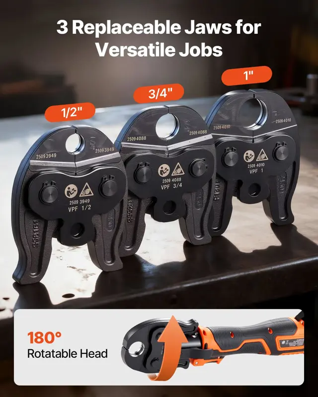 - Compatibilidad versátil: Incluye tres mordazas de prensa VPF de tamaños 1/2" , 3/4" y 1" para adaptarse a diversos anillos de acero inoxidable para tuberías PEX, asegurando crimps precisos y seguros para diferentes diámetros de tubería.