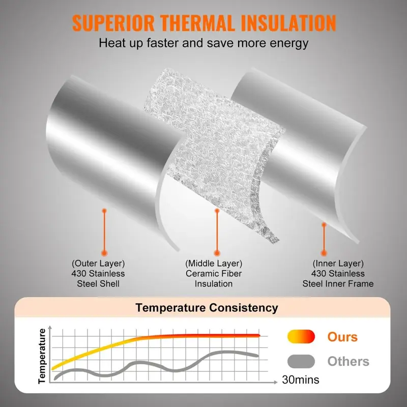 Construcción duradera: el horno de pizza de propano VEVOR soporta condiciones exteriores y uso frecuente. Adoptó un diseño de 3 capas, promoviendo la circulación eficiente del calor. Con una carcasa de acero inoxidable 430 y algodón aislante grueso, garantiza durabilidad y excelente retención de calor