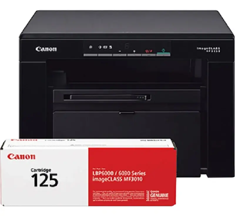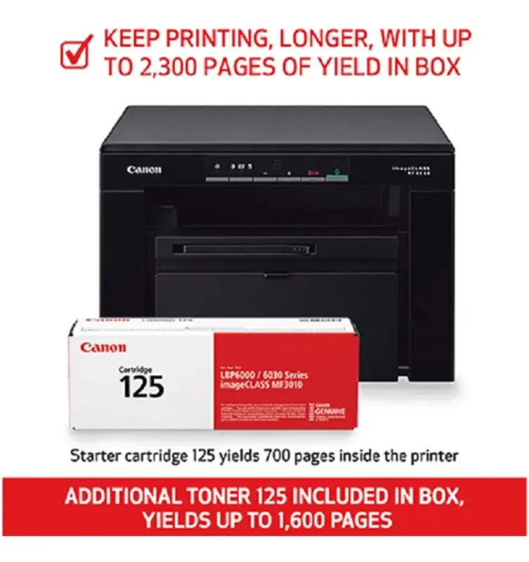 Componentes incluidos: Producto MF3010 VP, Cartucho 125 Negro Rendimiento de 2.300 páginas (tóner de arranque en la impresora = 700 páginas, tóner adicional en caja = 1,600 páginas), cable de alimentación, cable USB, CD de software de usuario, Guía de inicio, Tarjeta de garantía