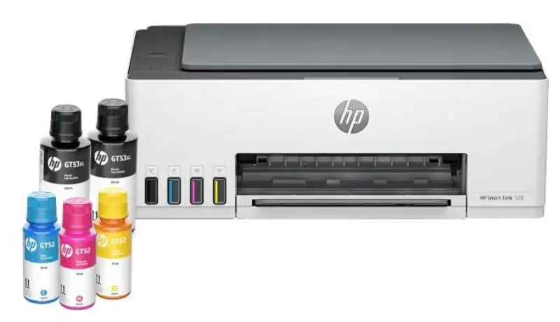 - Contenido de la caja: Impresora Todo-en-Uno HP Smart Tank 520; Botella de tinta original HP GT53XL, negro (135ml); Botella de tinta original HP GT52, cian (50 ml); Botella de tintaoriginal HP GT52, magenta (50 ml); Botella de tinta original HP GT52,amarillo (50 ml); Cabezal de impresi¦nn HP Smart Tank; Gu¦_a de instalaci¦nn; Gu¦_a de referencia; Volante de advertencia sobre tintas; Volante reglamentario; Volante de garant¦_a, Cable de alimentaci¦nn; Incluye 1 botella adicional de tinta original GT53XL negra de 135 ml. Para obtener m¦¡s informaci¦nn sobre el llenado y rendimiento, consulte http://www.hp.com/go/learnaboutsupplies.