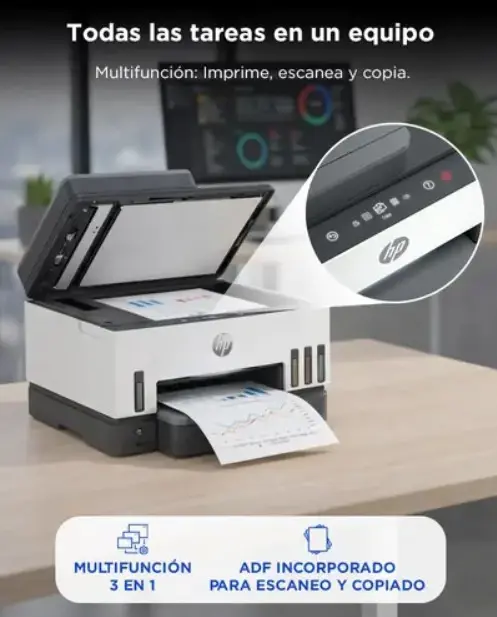 Imprime, escanea y copia documentos desde un solo equipo, optimizando espacio y tiempo. Una solución práctica para estudio, trabajo y trámites.