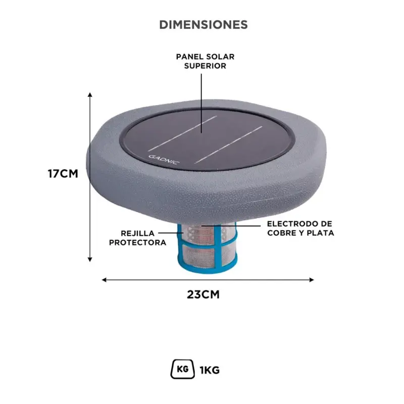 Mantené el agua de tu pileta cristalina, saludable y libre de químicos agresivos gracias a la tecnología de ionización solar GADNIC. Este sistema convierte la luz del sol en energía limpia para liberar iones de cobre que eliminan algas, bacterias y minerales no deseados, manteniendo tu piscina pura todo el verano.