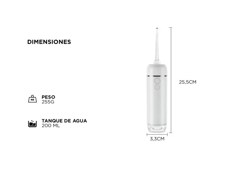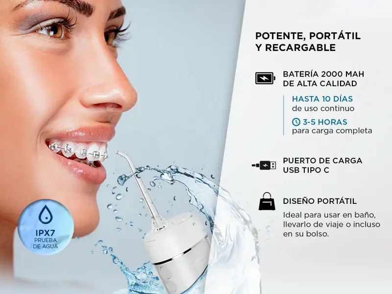 Potente, portátil y RECARGABLE. El mismo cuenta con modos de operación para una mejor experiencia de blanqueo, entregando una presión de agua de 30 a 110 psi y una frecuencia de agua de hasta 1800 chorros / minuto.