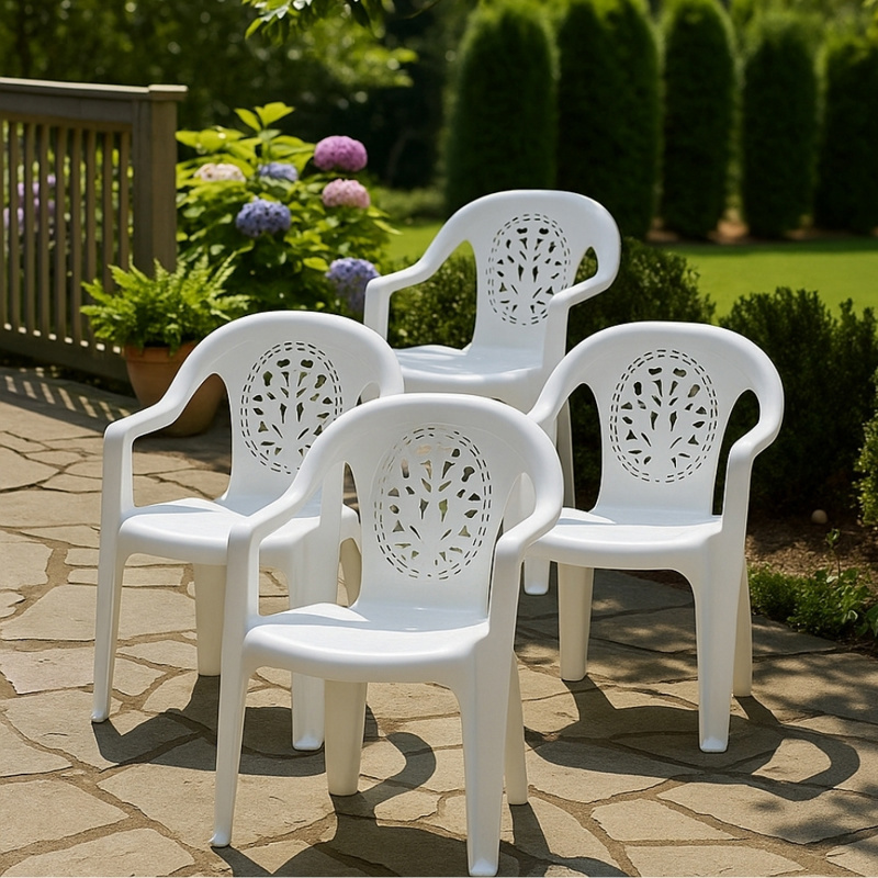 Juego de 4 Sillas de Plástico para Jardín Moon con Apoyabrazos – Reforzada y ApilableTransformá tu jardín en un espacio de confort y estilo con la Silla de Jardín Moon de Plastrum, diseñada para quienes valoran la funcionalidad, durabilidad y estética moderna. Ideal para disfrutar de largas horas al aire libre, esta silla combina practicidad con un diseño elegante y minimalista que se adapta a cualquier ambiente, desde patios modernos hasta jardines clásicos.Características principales:Material: Plástico PVC de alta calidad, reforzadoColor: Blanco eleganteMedidas: 48 cm (largo) x 46 cm (ancho) x 80 cm (alto)Peso: 1,7 kg – liviana y fácil de trasladarCapacidad de carga: soporta hasta 150 kgApilables: ahorran espacio al guardarlasCon apoyabrazos: mayor comodidad en el uso diarioResistentes a rayos UV: no se decoloran al solFácil de limpiar y mantenerBeneficios:Perfectas para uso exterior en cualquier estación del año: soportan sol, humedad y variaciones climáticas.Estables y resistentes, con diseño ergonómico para mayor confort.Prácticas: se apilan fácilmente, optimizando espacio de guardado.La línea Moon es la elección inteligente para quienes buscan estilo y practicidad en sus muebles de exterior. Ya sea para relajarte leyendo un libro, compartir charlas con amigos o disfrutar de una comida en familia, estas sillas premium van a convertir tu jardín o terraza en un espacio de encuentro y confort.