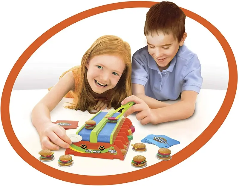 ¿Qué tan rápido puedes construir una hamburguesa? Burger Mania combina movimiento y habilidad para una experiencia de juego divertida, atractiva y gratificante. ¡2 jugadores compiten para construir una hamburguesa personalizada a partir de la tarjeta de recetas que elijan! ¿Bollos, lechuga, queso, tomate? ¿Qué hay en tu hamburguesa? ¡Trabaja lo más rápido que puedas para terminar de construir tu hamburguesa antes de que llegue al final de la cinta transportadora móvil o tendrás que comenzar de nuevo! Gana el chef que más hamburguesas prepara. Con 3 niveles de dificultad, este es un juego que los niños jugarán una y otra vez. Avanza al siguiente nivel de habilidad a medida que te vuelves más eficiente con tus habilidades de construcción de hamburguesas. Además, Burger Mania ayuda a los niños a desarrollar y refinar las habilidades motoras finas y la destreza, ya que los jugadores deben usar pinzas para construir sus hamburguesas ordenadas.
