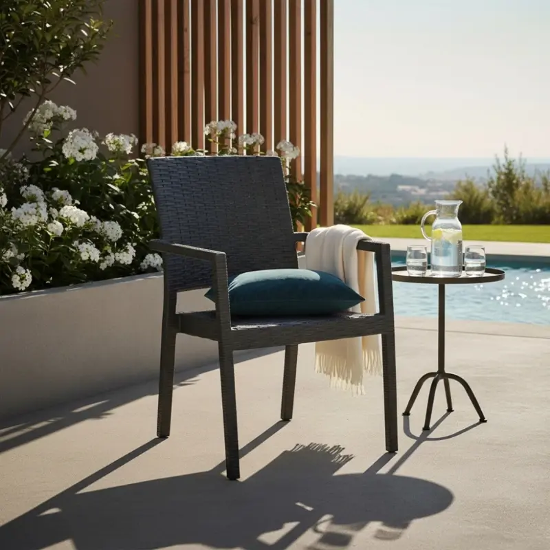 Diseñado en polipropileno de alta densidad, este sillón en tono negro elegante es la elección ideal para terrazas, jardines y balcones. Su estructura reforzada garantiza máxima resistencia sin sacrificar el diseño.