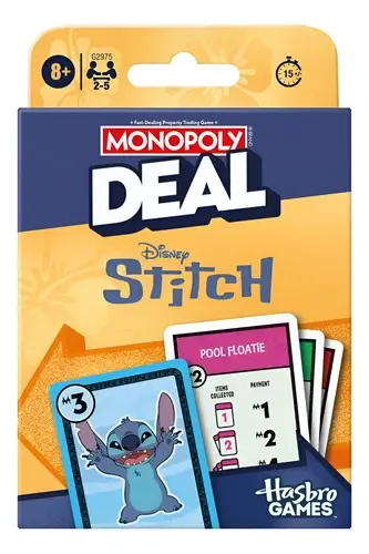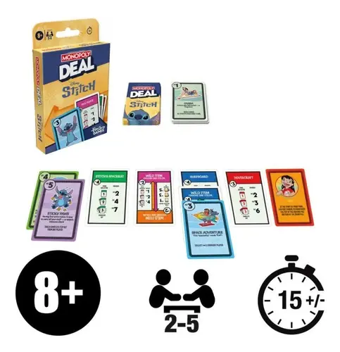En el juego de cartas para niños Monopoly Deal: Edición Disney Stitch, compite para conseguir objetos conocidos del mundo de Stitch. ¡Gana la búsqueda al ser el primero en conseguir 3 sets de objetos diferentes!