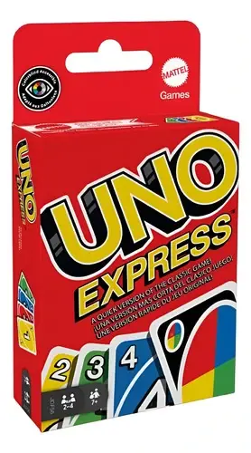 UNO es el clásico y amado juego de cartas que es fácil de llevar a todos lados e imposible de soltar.UNO Express ofrece toda la diversión de UNO, pero con una dinámica de juego más rápida, que le permite a los jugadores terminar las rondas más rápido. La baraja más pequeña hace que esta versión de UNO sea portátil y fácil de llevar a todos lados. Los jugadores toman turnos para hacer pares con una carta en su lote, con la carta que se muestra en la parte superior de la baraja, ya sea por su color o su número. Las cartas de acción especial brindan momentos que cambian el rumbo del juego y cada una cumple una función que te ayuda a vencer a tus oponentes. Y no olvides gritar “¡UNO!” cuando te quede una sola carta. Gana el primer jugador en deshacerse de todas las cartas de su mano antes de que lo hagan sus oponentes. Excelente juego de mesa para una noche de juegos para 2 a 4 jugadores. Incluye 56 cartas e instrucciones. Los colores y las decoraciones pueden variar