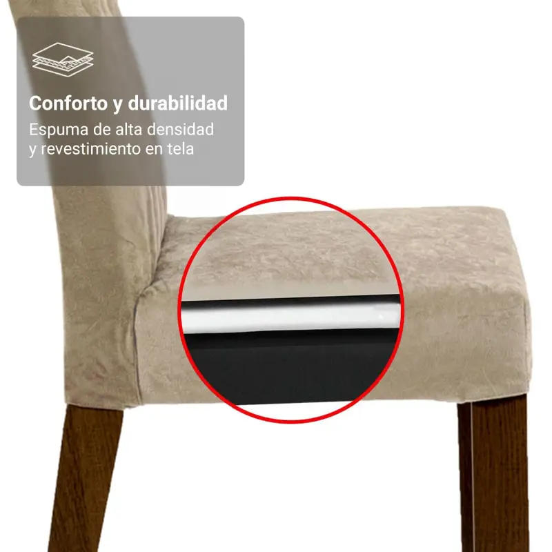 Las sillas aportan aún más comodidad al conjunto. Con estructura de MDF y asiento en polipropileno. Y lo mejor de todo, ¡son súper confortables! El respaldo y los asientos están acolchados con espuma de alta densidad y recubiertos con tela Suede Imperial, de tacto suave y liso. Además, tienen bonitas costuras de estilo matelasé.