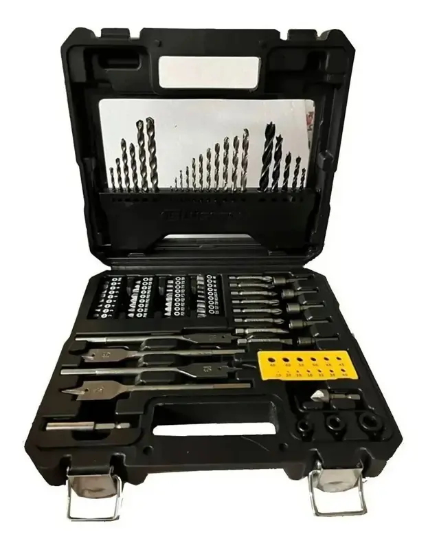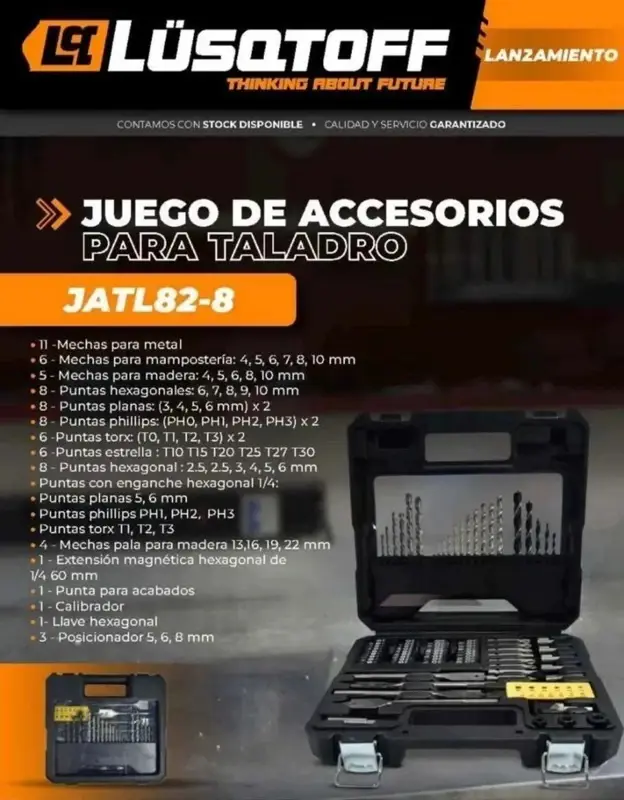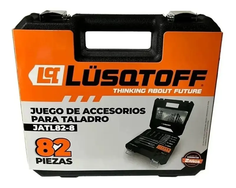 Juego Kit de Mechas Puntas 82 Piezas con Maletin Lusqtoff Jatl82-8 Modelo Jatl82-8 Marca: Lusqtoff Modelo: JATL82-8 11 Mechas para metal: 1.5, 2, 2.5, 3, 3.5, 4, 4.5, 5, 5.5, 6, 6.5mm 6 mechas para mamposteria 4, 5, 6, 7, 8, 10mm 5 Mechas para madera 4, 5, 6, 8, 10mm 5 tubos: 6, 7, 8, 9, 10mm 8 Puntas planas: 3, 4, 5, 6mm x2 8 Puntas Phillips: ph0, ph1, ph2, ph3 x2 8 Puntas pozidrive: pz0, pz1, pz2, pz3 x2 8 Puntas Torx: T10, T15, T20, T25, T27, T30 8 Puntas hexagonal 2.5 2.5 3 4 5 6 8 Puntas encastre 1/4 4 Mechas pala para madera: 13, 16, 19, 22mm 1 extension magnetica 1 Avellanador 1 Calibrador 1 llave para tope 3 Tope para mecha 5, 6, 8mm Origen: China
