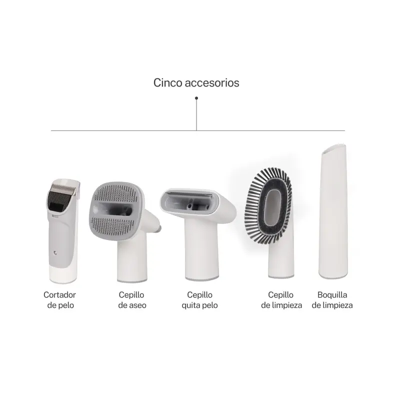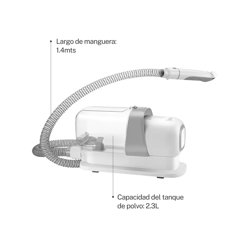 Especificaciones:• Filtro HEPA• 3 velocidades• 5 accesorios• Largo de la manguera: 1,4mts• Poder de succión: >10KPA• Capacidad del tanque de polvo: 2.3L• Tamaño del producto: 345x133x206mm• Largo del cable: 2.5mts• Peso: 2.7Kgs• Grado de ruido: 74dBAIncluye:• Cinco accesorios:- Cepillo de aseo- Cepillo quita pelo- Cepillo de limpieza- Boquilla de limpieza- Cortador electrico + 4 peines