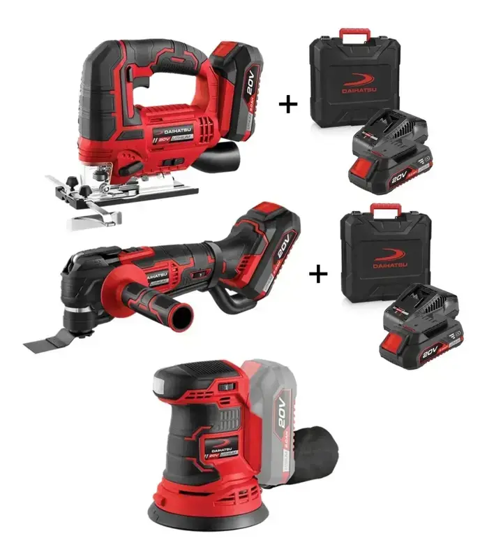 Este combo de alto rendimiento de la línea 20V de Daihatsu reúne tres herramientas esenciales para transformar cualquier proyecto. Con tecnología de iones de litio, permite lijar, realizar cortes precisos, calar y ejecutar tareas de detalle sin cables, garantizando potencia constante y máxima versatilidad en el taller o la obra.