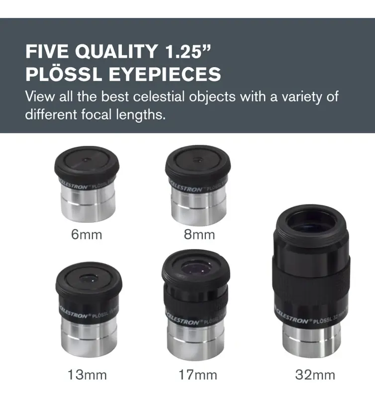 5 Ojales PLÖSSL de grado superior: el kit de accesorios ___ incluye 5 oculares telescopio Plössl, que van desde baja a alta potencia: 1.260 in, 0.669 in, 0.512 in, 0.315 in y 0.236 in. Cada ocular cuenta con un diseño de cuatro elementos con un campo de visión de 52 grados.