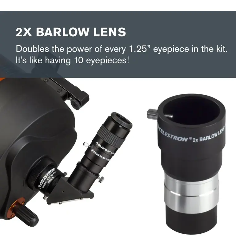 Lente Barlow 2X: La lente Barlow 2x se empareja con cada uno de los 5 oculares de este kit o cualquier ocular de 1.25 para duplicar su aumento, mejorando su visión y aumentando instantáneamente la potencia. Es como tener 10 oculares de telescopio en tu kit.