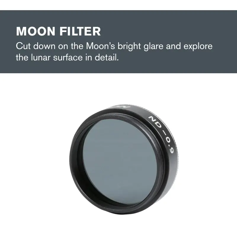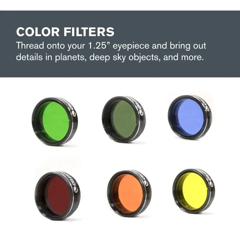 FILTROS DE COLORES PARA VISTA ASTRONÓMICA: Un filtro lunar y los filtros planetarios más populares están incluidos en este kit. Diviértete viendo lo que revelará un filtro azul en Júpiter, o descubre los casquetes polares en Marte con un filtro rojo o naranja.